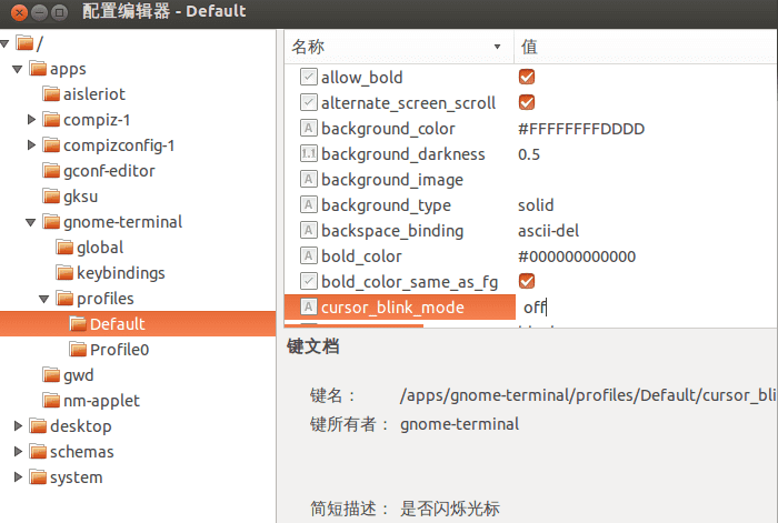 于是我兴冲冲地跑到 ubuntu(12.04) 上,准备如法炮制。但是却傻眼了,人家的配置窗口里压根就没有这一项。于是在网上搜索如何关闭 ubuntu 的终端的光标闪烁。这回搜到了靠谱的方法。在终端运行 gconf-editor 或者点击「应用程序」--「系统工具」-「配置编辑器」。打开了一个类似 Windows 中的注册表的程序。依次找到 /apps/gnome-terminal/profiles/Default,将 cursor-blink-mode 的值由默认值「system」修改为「off」即可,如下图所示。