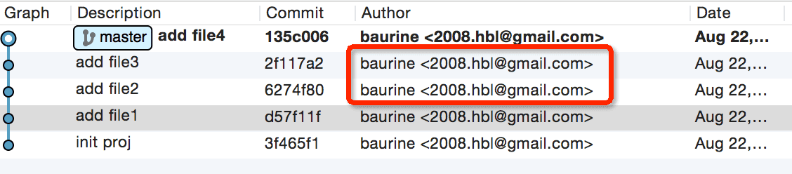 起因是这样的,在某天提交代码的过程中,发现有几次历史提交的 author 信息不对,可能是 user.name 和 user.email 的信息被修改了,就像下面这样: