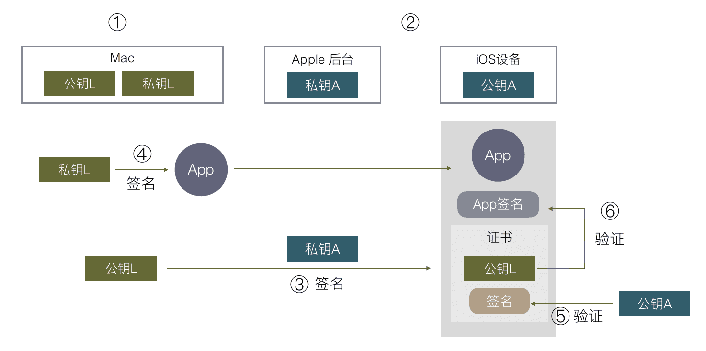 - iOS 设备在安装 APP 时,首先用内置在设备中的 Apple 公钥,对 APP 中的证书进行验证,验证 OK 说明证书中包含的 APP 公钥是信赖的。验证失败,则不允许安装。