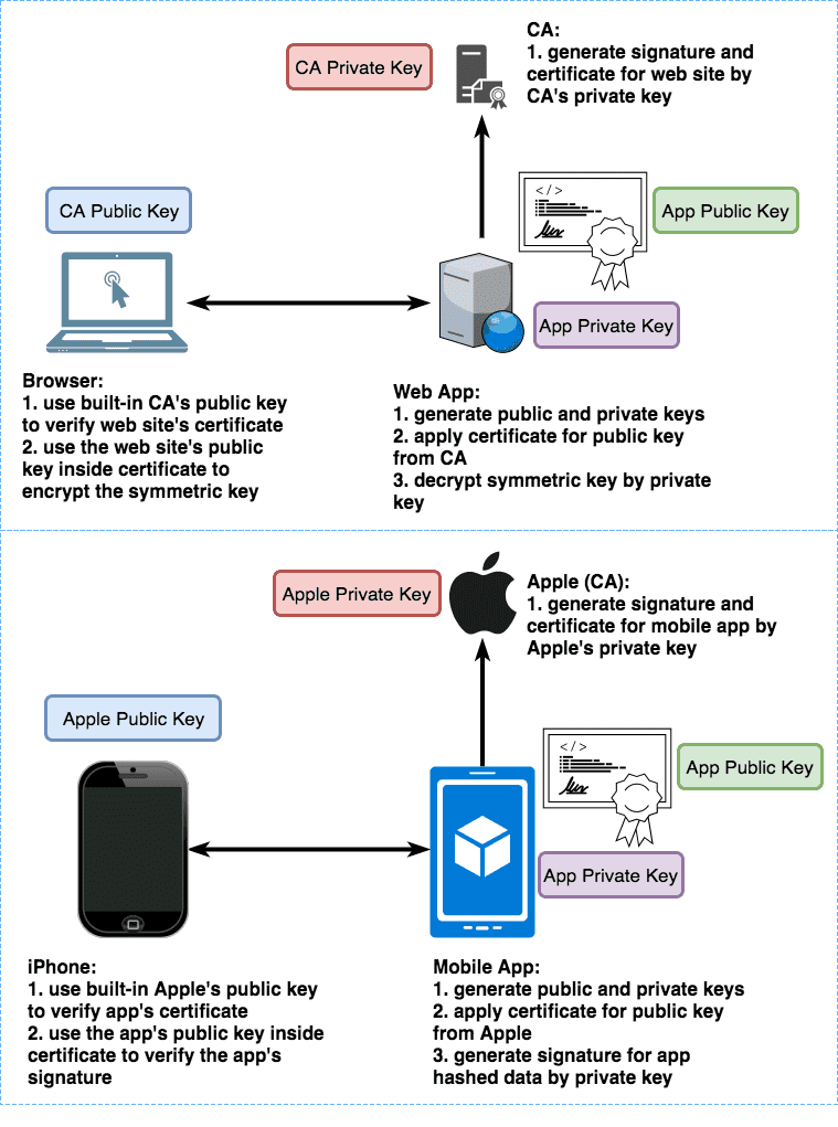 平时在做 Android 开发的同时,偶尔做做 iOS 开发,同样是代码签名,Android 并不需要向 Google 申请什么证书,但对于 iOS APP 来说,需要向 Apple 申请证书,为了生成证书,又要生成公钥和私钥,我对这个流程一直搞不清,为什么需要这些证书,这些证书是用来做什么的?