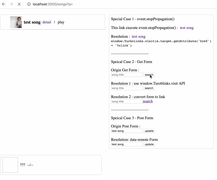 }因为 Turbolinks 只能处理 <a> 链接,而且 Turbolinks 将 click event listener 绑定在最顶层的 window 对象上,而不是直接在 <a> 上,所以以下几种情况 Turbolinks 无法处理:
