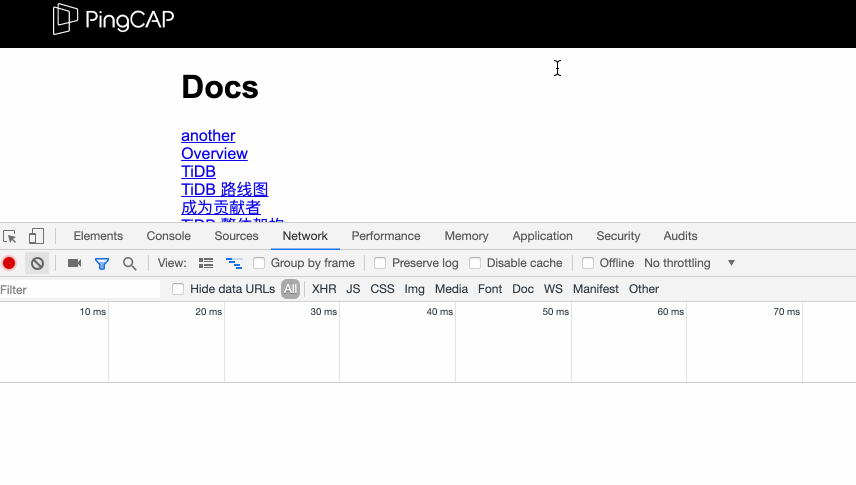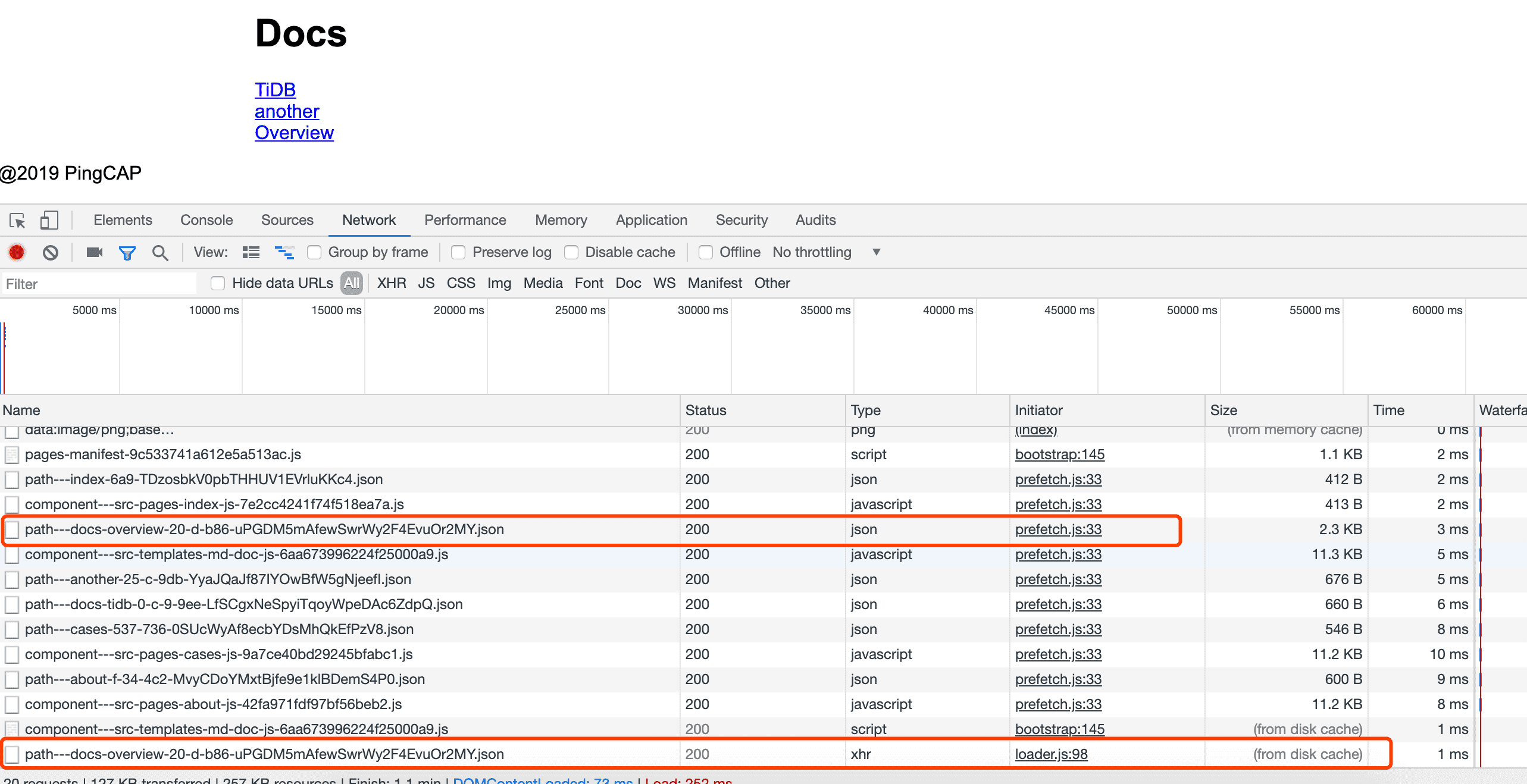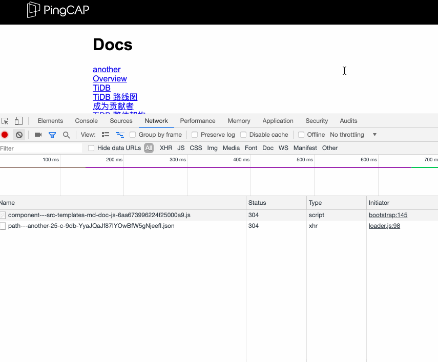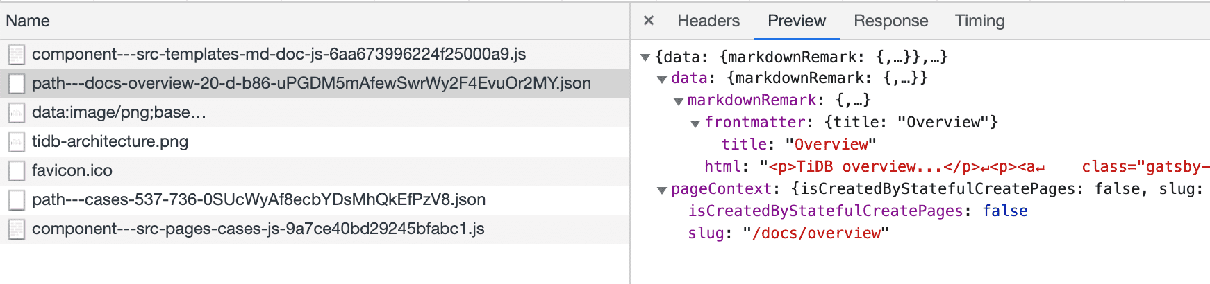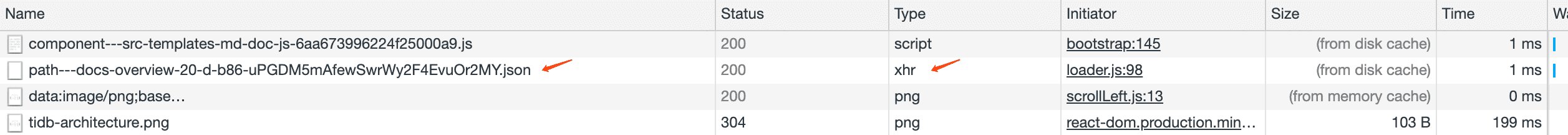 我们点击某个 markdown 生成的页面链接后,在 inspect 的 Network tab 下可以看到,发出了一个 ajax 请求,请求了一个静态的 json 文件。