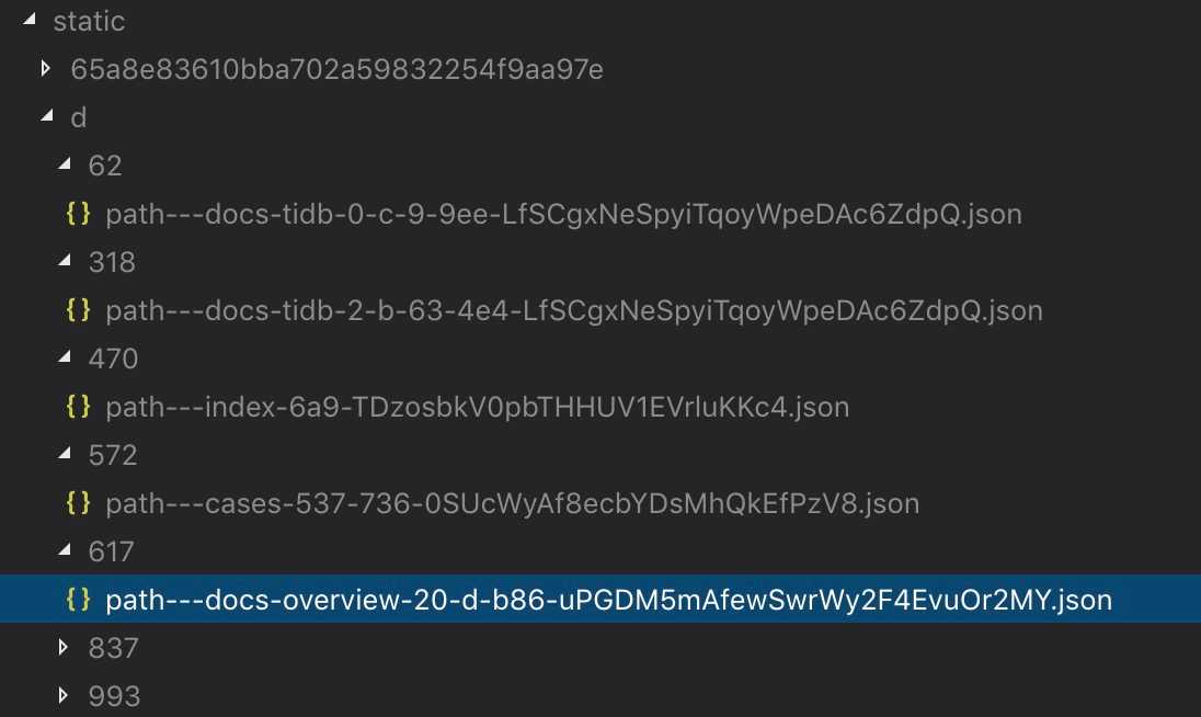 `;可见,gatsby 将每个页面通过 graphql 查询得到的数据保存到了单独的 json 文件,每个页面对应一个 json 文件。