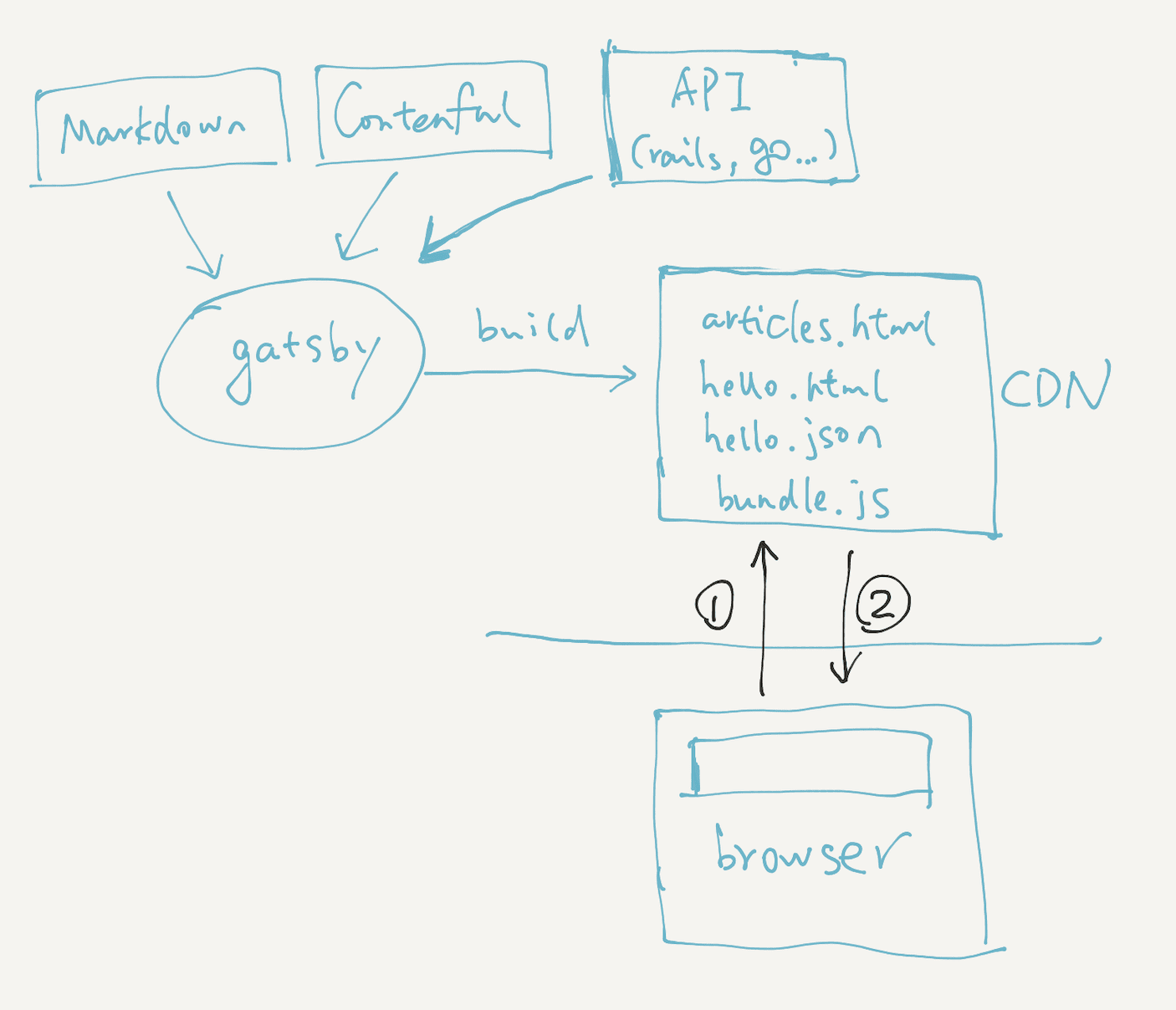 /articles,则得到的是 /articles.html,如果是 /hello,则得到的是 /hello.html,假定这里我访问的是 /articles。/hello,jekyll/hugo 会去 CDN 访问相应的 html 文件,但 gatsby 不会,前面说到,它会在客户端这边接管所有剩余的路由,因此 gatsby 会根据 /hello 路由在客户端这边用 js 渲染相应的页面,那数据来自何处,前面说到每一个 html 都有一个相应的 json 文件,json 文件存储的就是各页面对应的数据,因此 gatsby 在客户端渲染不同的页面时,会通过 ajax 请求去取相应的 json 文件,取回来后解析成 object 做为各个 compoment 的 props。详细的分析看这篇文章 - gatsby 是如何做到无刷新的页面跳转以及瞬间加载PS: 以上仅个人拙见,很多表述做了简化处理,跟实际工作流程不一定完全相符,但整体的原理是没有太大偏差的。